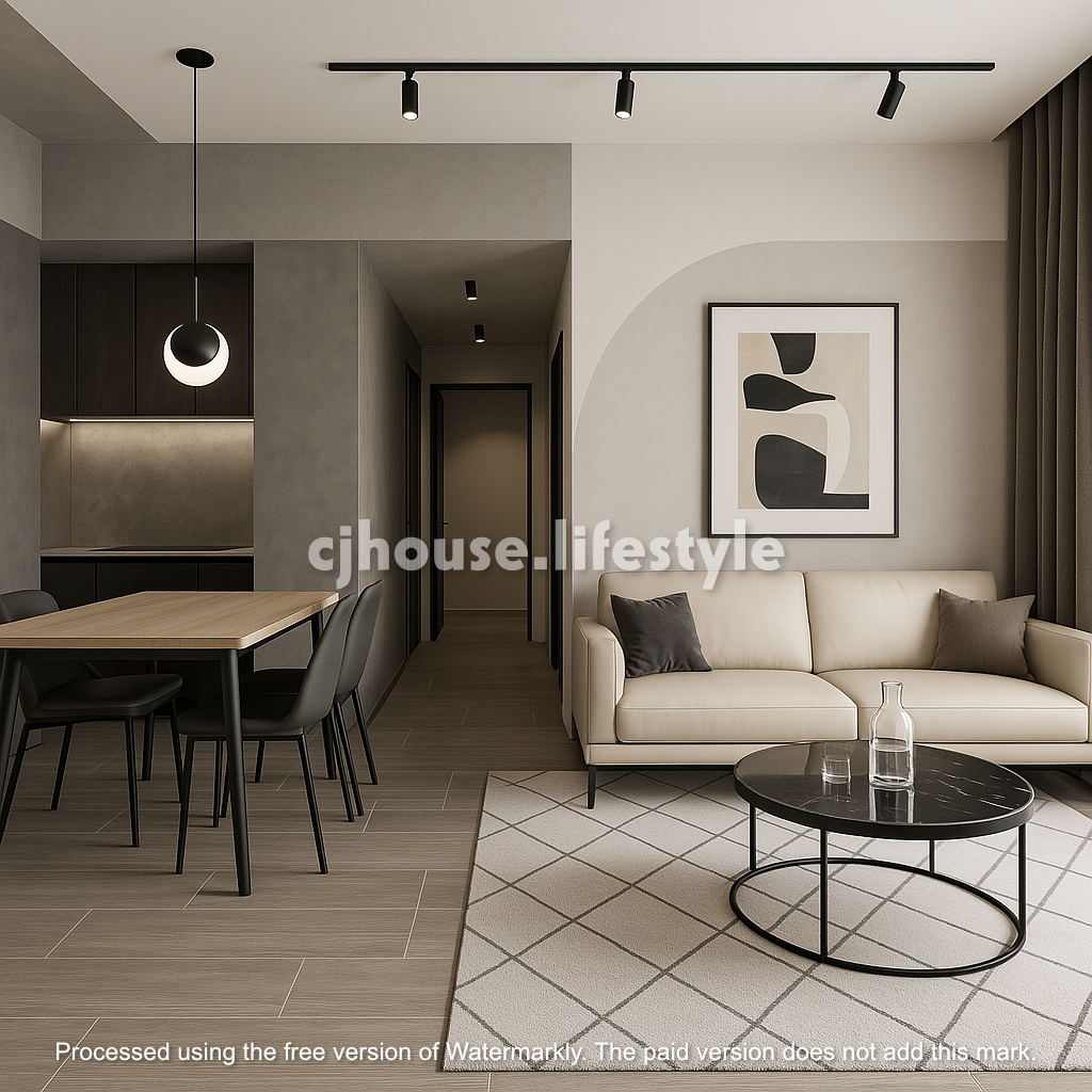 請幫我根據這張照片設計一個現代風格的家 家具/系統櫃的相對位置都不用移動 可以換上比較符合現代風格的家具和裝潢